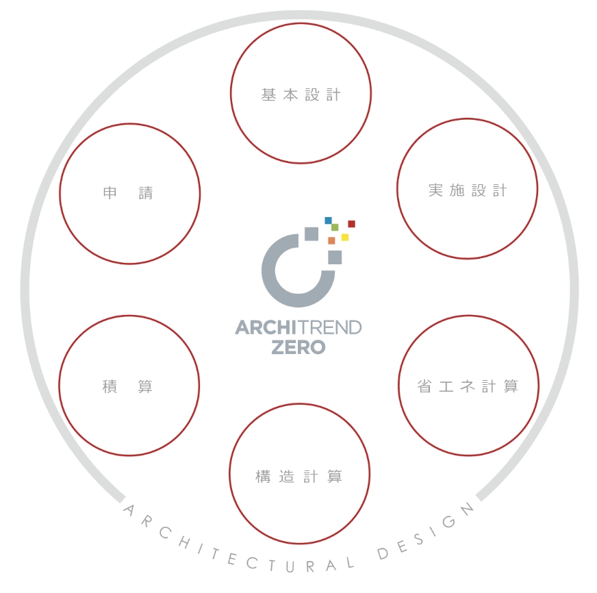 建築設計事業では、3D建築CADシステムARCHITREND ZEROを使用し、木造建築のプランニング、外観デザイン、設計図書の作成などを行う『基本設計・実施設計業務』から、構造計算、外皮計算、省エネルギー計算などを行う『各種計算業務』、建築確認申請や省エネ適合性判定、BELS評価、設計住宅性能評価などの『各種申請業務』に至るまで、すべての設計業務を一気通貫で行っています。